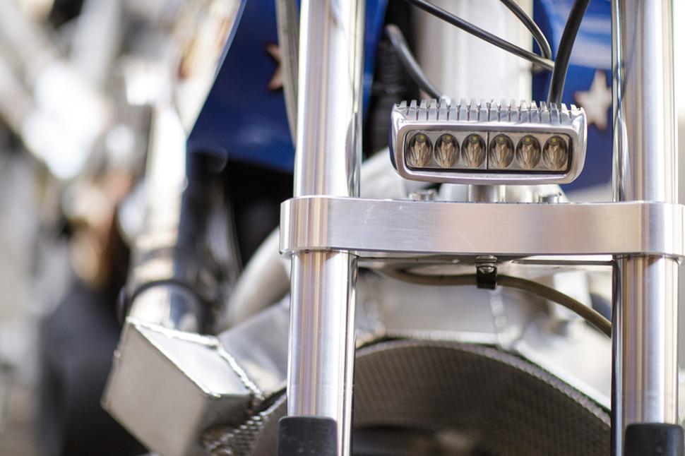 Спереди вместо стокового был установлен радиатор от Ducati Monster. Что касается фары, у Ивела её не было, так что Колин хотел сделать её как можно более незаметной. Он остановил свой выбор на диодной фаре от Rigid Industries, которую он отполировал и установил между траверсами.