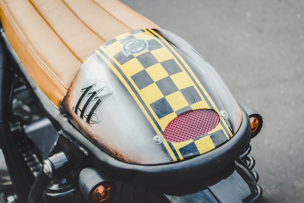 Мы хотели привести к балансу оригинальный топливный бак и заднюю часть мотоцикла. Для этого мы изготовили алюминиевый хвост, который одновременно служит кожухом для аккумулятора, основой для сиденья, а также здесь установлен задний фонарь. Топливному баку вернули его оригинальную форму: он очень пострадал в аварии, а также опустили точки крепления. На топливный бак и хвост нанесли клетчатый рисунок, а часть необработанного металла покрыли прозрачным лаком.