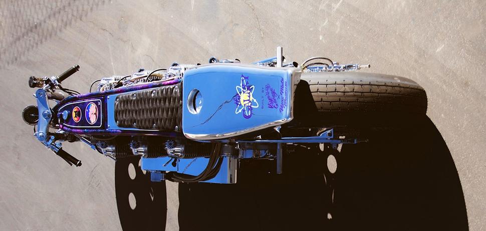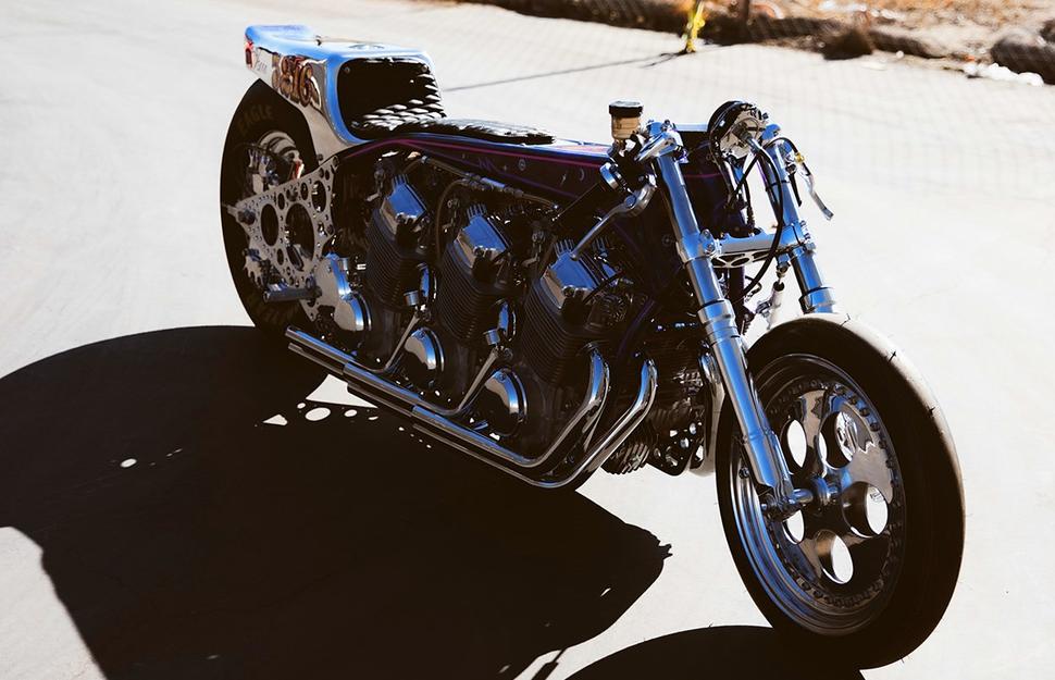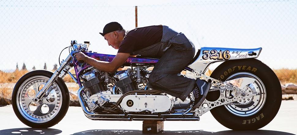 Мотоциклы для наземных гонок на скорость имеют особенную конструкцию. Неспроста одно из названий этой дисциплины - drag racing - дословно переводится как “наперегонки со встречным ветром” или “гонка с набегающим потоком” - то есть соревнуешься ты не с другими гонщиками, а с самой стихией. Отсюда и аэродинамичный обвес (совершенно, впрочем, не обязательный в наше время), и лежачая “посадка”, и длинная колёсная база, предотвращающая вилли, вобблинг и другие сложности очень быстрой езды, и, конечно, максимальная производительность двигателя и идеально подобранные передаточные числа трансмиссии. Причём в этом спорте бал правят кастомы - каждый спортсмен или его команда делают мотоциклы по-своему и под себя. Иногда несколько выходя за рамки привычных конструкций, а порой мастера и вовсе строят нечто совершенно безумное. Как например вот эта Honda CB750 с тремя расточенными моторами.