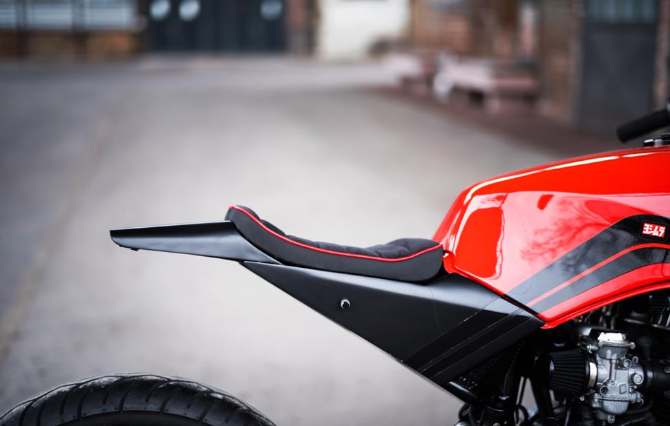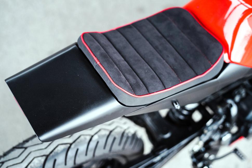 Поверх нового подрамника установили одиночное сиденье, для которого сначала согнули основу, а затем обшили её искусственной замшей, простроченной под цвет обвеса алыми нитками. Остальная часть обвеса по большей части осталась нетронутой - не считая подрезанного переднего крыла и зачернёного ветровика, придающего Honda намного более изящную внешность, чем заводские дизайнеры могли бы себе вообразить.