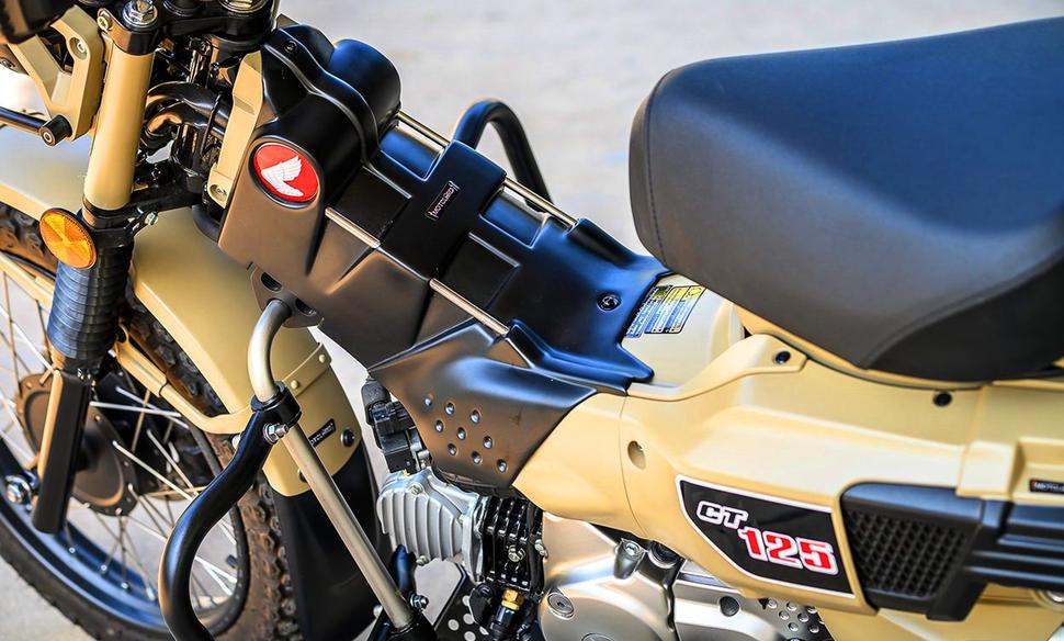 Спереди вся суровость мотоцикла в основном визуальная, и тем не менее он оснащён довольно практичными дугами. Двигатель оснастили оребрёнными крышками, а под сиденьем виден стильный кожух воздушного фильтра, придающий CT “тактический” вид. Центральный элемент рамы от рулевой колонки до сиденья закрывает подобный же кожух, являющийся элементом крепления для багажа.