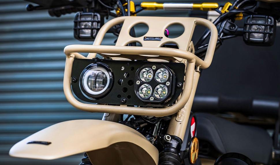 Чайакрит установил сдвоенную диодную фару на мощном креплении, которое ставится на место стоковой одиночной фары. Крепление настолько мощное, что выступает заодно и небольшим багажником, а по бокам от него установлены квадратные дневные ходовые огни на кастомном руле.