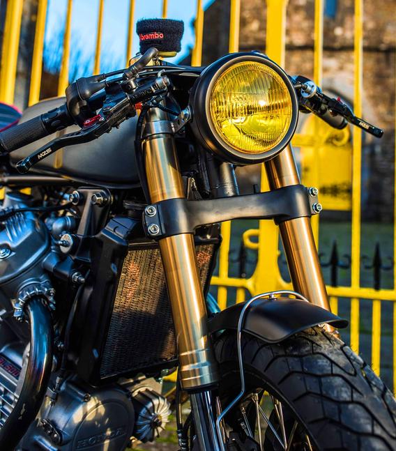 Есть и другие изменения, вроде бы небольшие, но складывающиеся в общую картину - более мелкий бак, окрашенный в нейтральный цвет, визуально выделяет на первое место двигатель, а желание Брайана сделать пустое пространство под сиденьем было легко реализовано при помощи кастомного сиденья. Но и функционал не оставили без внимания - под сиденьем незаметно притулился маленький задний фонарь, а переднее колесо прикрывает симпатичное крыло.