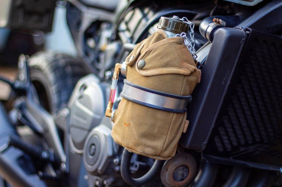 Мы срезали дно бака Hornet и приварили к верху бака CX, установили стеклянную шкалу уровня топлива, потом вварили в бак CX горловину от Hornet для более утилитарного вида и чтобы сохранить замок под ключ. Затем - кастомный задний подрамник, маленький и симпатичный, но достаточно вместительный для аккумулятора, мозгов ABS, датчиков и электрики. Поверх него - кастомное сиденье с перфорированным винилом под стать грипсам Progrip и передней перфорированной табличке. Диодная фара на ней - от Jeep Wrangler JK на кастомном креплении, там же - цифровой спидометр Koso. Поворотники Koso в торцы руля установлены на руль для супербайка от ABM. Резервуар охлаждающей жидкости мы сделали из настоящей французской армейской фляжки образца 1941 года. Цельный задний свет производства Shin Yo, плюс дополнительный свет на крепления кофров для лучшей видимости, потому что с надетыми кофрами основной задний свет прячется за ними. Кстати, о кофрах - это настоящие армейские боксы Британской армии. Съёмные.