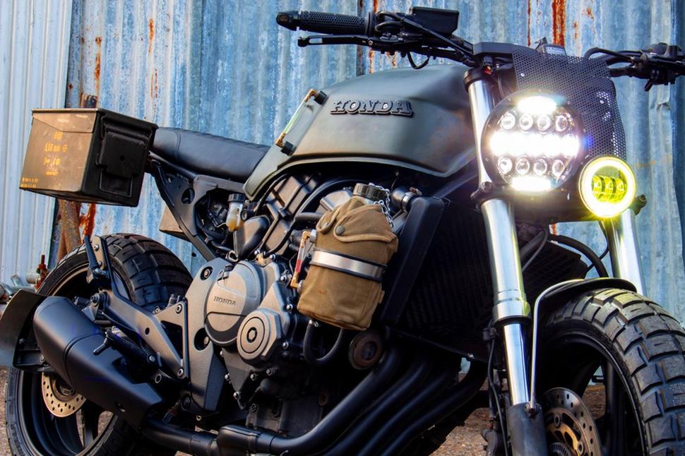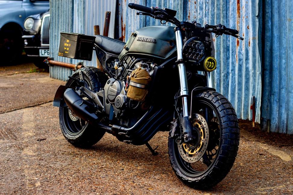 И только посмотрите на эти кофры, сделанные из оружейных ящиков британской армии, этот бачок антифриза из французской солдатской фляги 1941 года, этот подрезанный и переваренный бак Hornet/CX со стеклянной трубочкой уровня бензина! Кастом по имени Scout идеально подошёл Тиму, скучавшему по армейской кондовой эстетике, но не желавшему выглядеть клоуном, разгуливая в военной форме по мирному городу. Уникальный CB600F воплотил в себе суровую прагматичность армейской техники, её продуманную конструкцию и некоторую аляповатость и угловатость дизайна - словом, всё, что нужно ностальгирующему отставному вояке!
