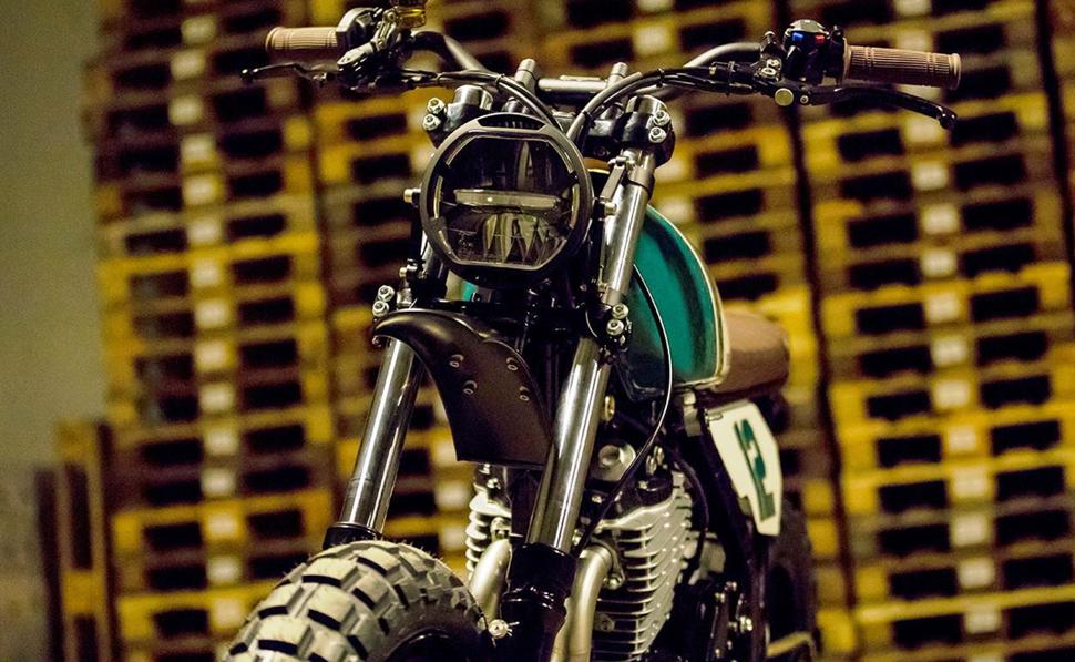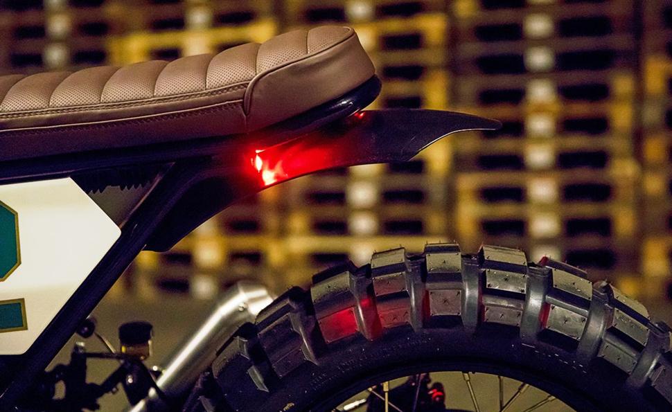 Позади него находится сиденье, обшитое коричневой кожей. Оно установлено на кастомном подрамнике с простенькой петлёй на торце. Дополняют новый имидж две вручную изготовленные алюминиевые боковины с номером 12 и высоко задранные крылья на обоих колёсах.