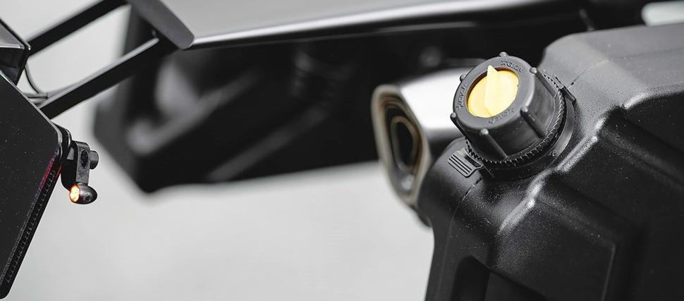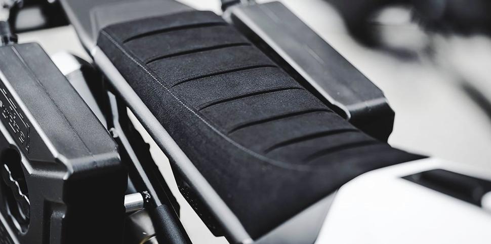 По бокам нового заднего подрамника размещены грузовые рамки, к которым прикреплены топливные канистры GKA, существенно увеличивающие запас хода мотоцикла. Подвеска Pro-Link оснащена новым амортизатором Wilbers.