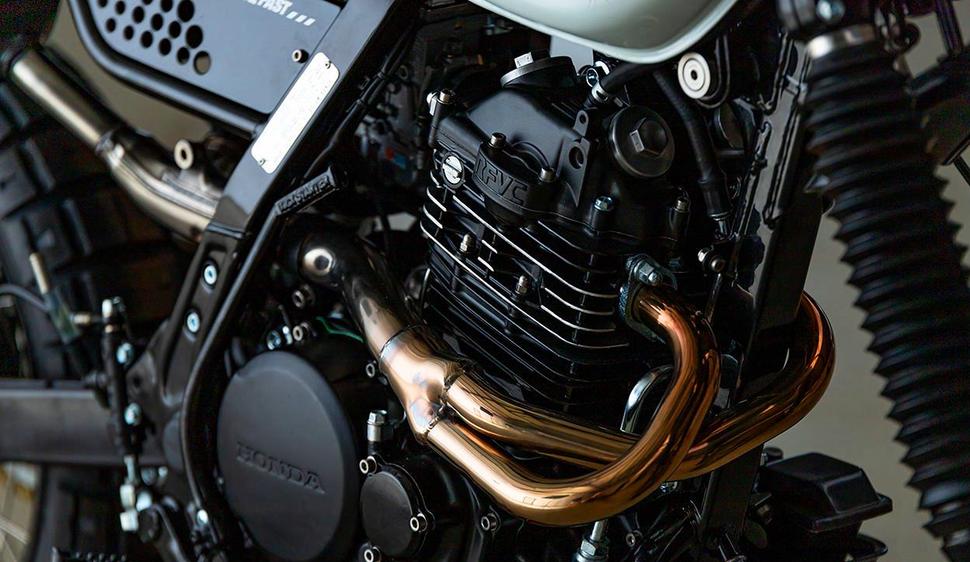 Разобравшись с рамой Honda NX650 Dominator, Хольгер взялся за следующую проблему: мотор работал не слишком хорошо. Пришлось его капиталить: новые кольца, клапана, подшипники и цепь ГРМ. Зажигание и карбюратор уже никуда не годились, так что Хольгер установил новое электронное зажигание и карб Mikuni TM40 с фильтром от K&N. Потом он буквально пошёл вразнос и заменил 33-летний привод сцепления на гидравлику от Magura.