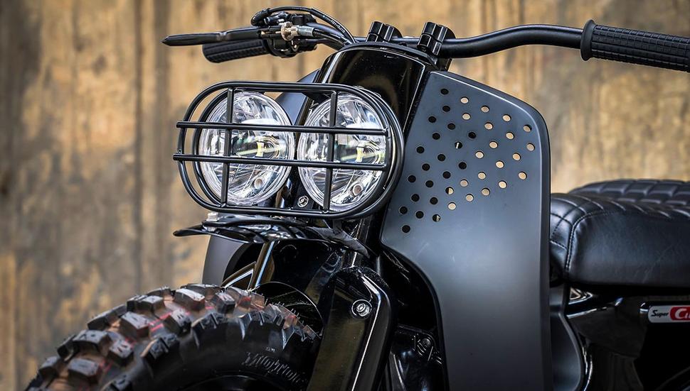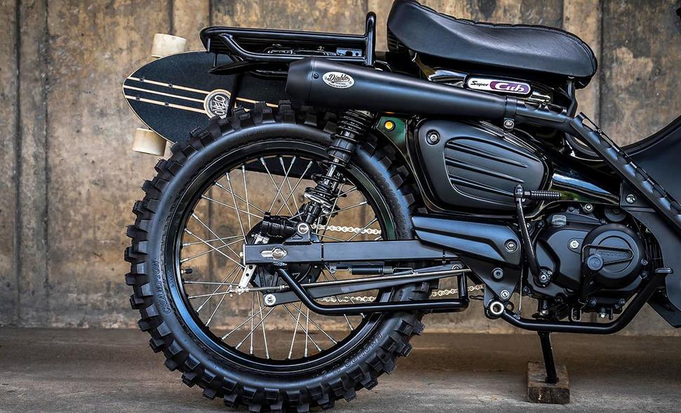 Но дело не только во внешности: даже осанка Honda Super Cub изменилась. K-Speed установили удлиннённый маятник, который уже ставили на Honda CT125, и благодаря этому - пару 17-х колёс. Super Cub всё ещё тормозит барабанами, зато едет теперь на шашечках.