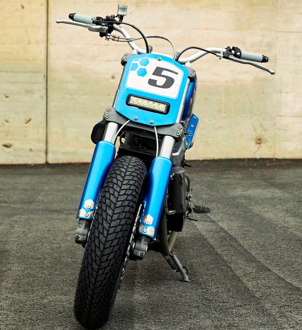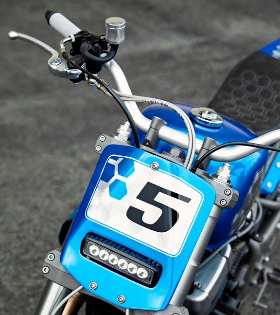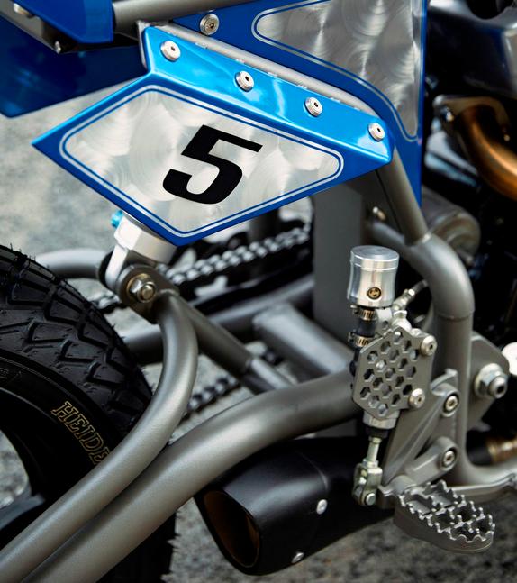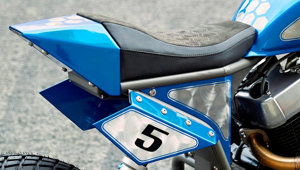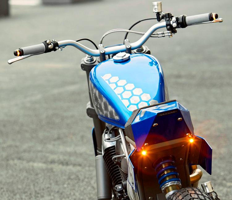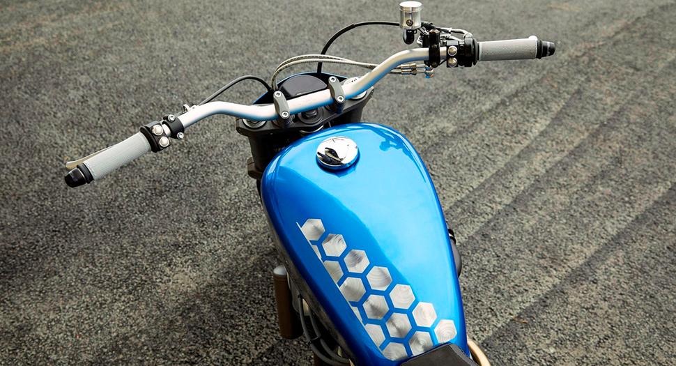 Ещё одна сквозная тема дизайна этого проекта - шестиугольные паттерны, видимые в окраске бака, передней таблички, кожухов вилки, хвоста, а также в отстрочке сиденья. Более того, SBC соорудили шестиугольные экраны для защиты пяток и кожух передней звезды с 19 шестиугольными же отверстиями - небольшой, но изящный штрих. Кроме того, парни добавили короткую самодельную боковую подставку, зубастые подножки, слайдеры маятника и самодельную ёмкость маслоуловителя на вентиляцию картера.