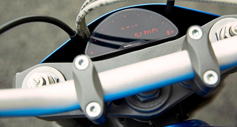 Остальные электрические компоненты - того же высокого уровня: приборная панель Motogadget Motoscope Pro, пульты того же производителя, диодные поворотники в торцы руля от Kellerman и крохотный задний диодный свет. Эргономика и посадка были полностью переделаны: загнутый назад трекерный руль, новые грипсы, фрезерованные бачки и армированные сталью тормозные магистрали.