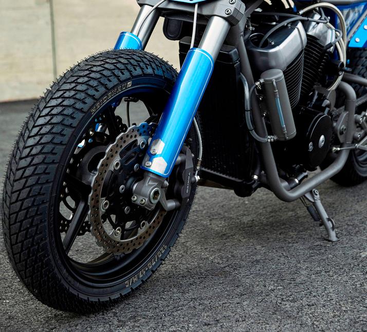 На противоположном конце Honda VT 750, SBC заменили стоковую вилку на перевёртыш от Ninjz ZX-6R, установленную в модифицированные траверсы от новой модели Z1000. Передняя тормозная система теперь состоит из двух четырёхпоршневых суппортов Tokico от GSX-R1000 на огромных лепестковых дисках. А тормозные диски установлены на кованных алюминиевых колёсах от Ninja 650 (или ER6N), обутых в Heidenau для грязевого овала.