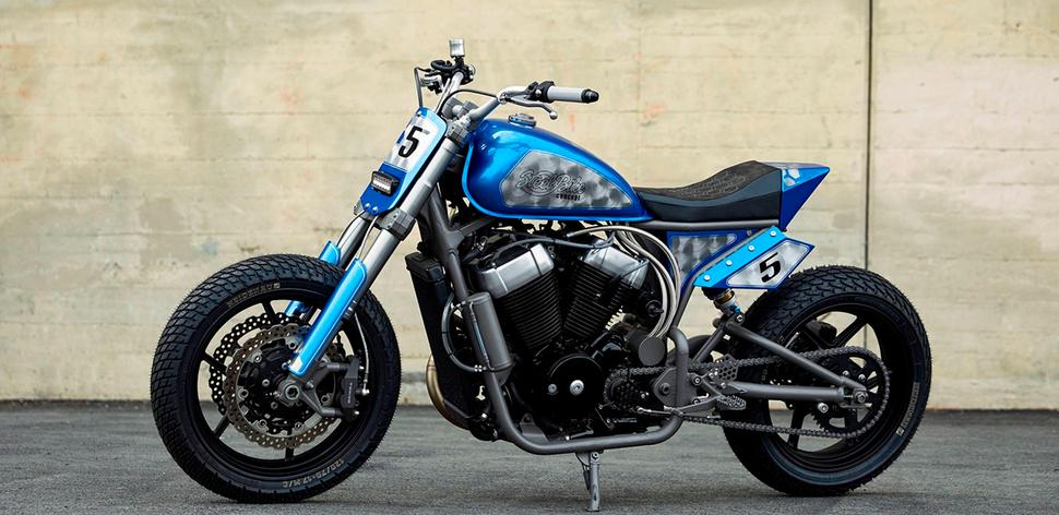 Чернёный 52-градусный V-твин с полированными клапанными крышками был оттюнен: он получил гоночный воздушный фильтр K&N и кастомный выхлоп со спортивным глушителем, аккуратно проходящим по низу мотоцикла вдоль нового маятника.