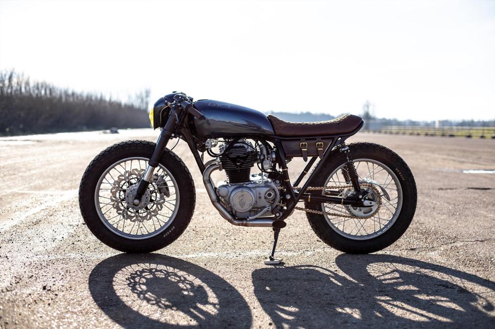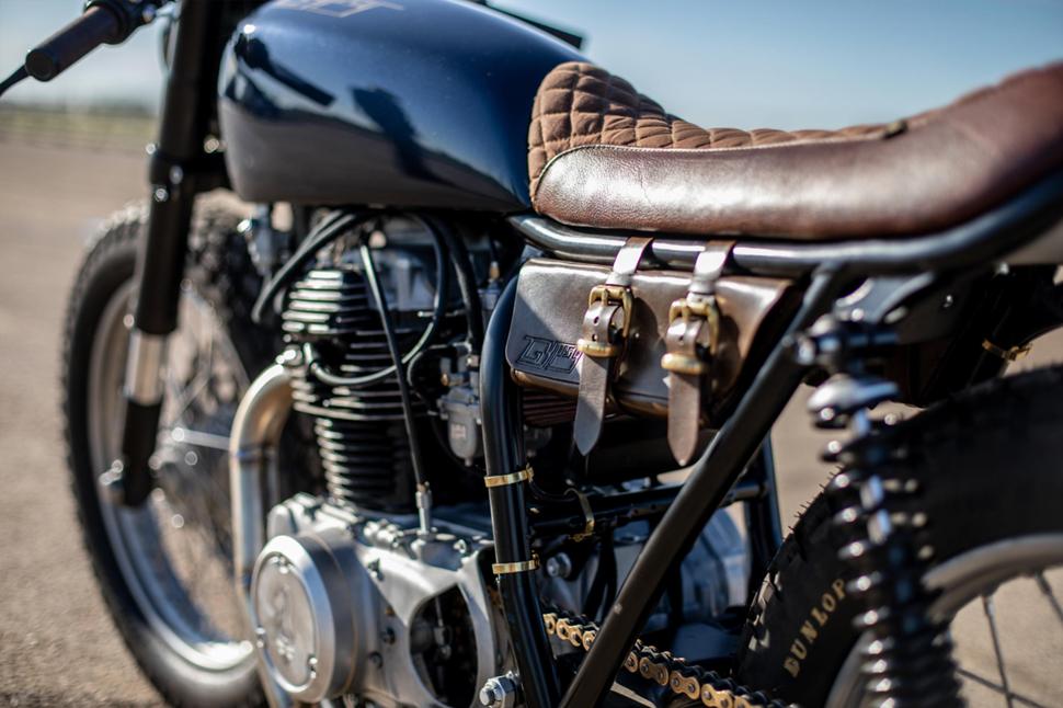 Но это еще не всё. Кожаные грипсы и подножки, сделанные Old Empire. Сшитое вручную сиденье от компании GB Upholstery. Великолепное лакокрасочное покрытие, выполненное Black Shuck. Керамическое покрытие от Flying Tiger Coatings. Даже сделанные клиентом подседельные сумки потрясающие.