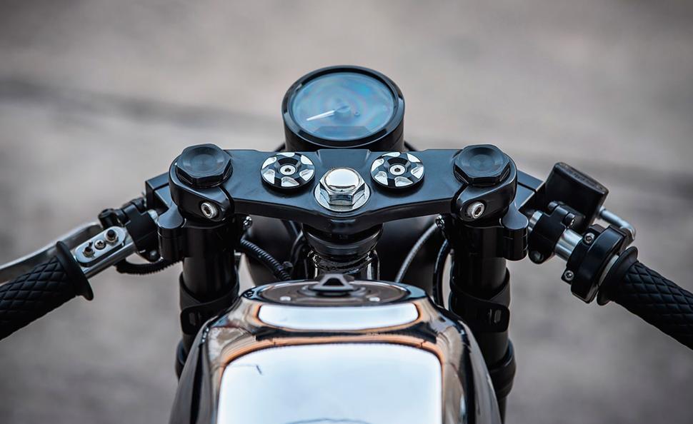 Посмотрим на органы управления кафе рейсера, теперь они выглядят более минималистично. Руль и проставки убрали, верхнюю траверсу выкрасили в черный цвет и установили клип-оны, благодаря которым водительская посадка стала гораздо ниже, как у "взрослых" кафе рейсеров.