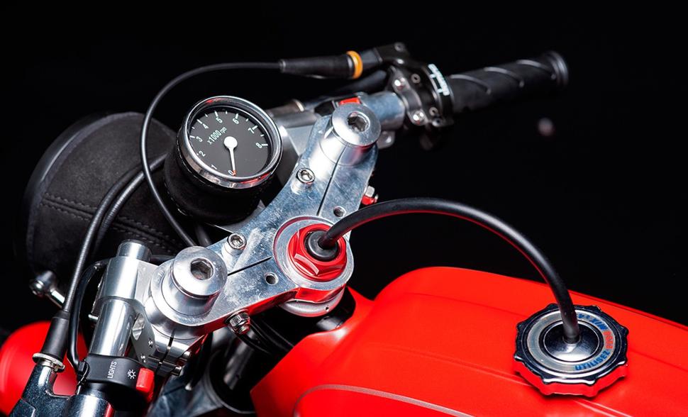 Также для того, чтобы переделать триальный мотоцикл в кафе рейсер, требуется уделить особое внимание мелким деталям. Пьер собственноручно изготовил несколько десятков мелких деталей, включая крепления топливного бака, сиденья и сдвинутые подножки, а также адаптировал алюминиевые рычаги Tarozzi для ножных органов управления.