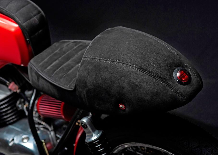 Новый задний обтекатель обшит материалом под замшу черного цвета; он стал продолжением сиденья, которое сделали в мастерской Kabuki Sellerie.