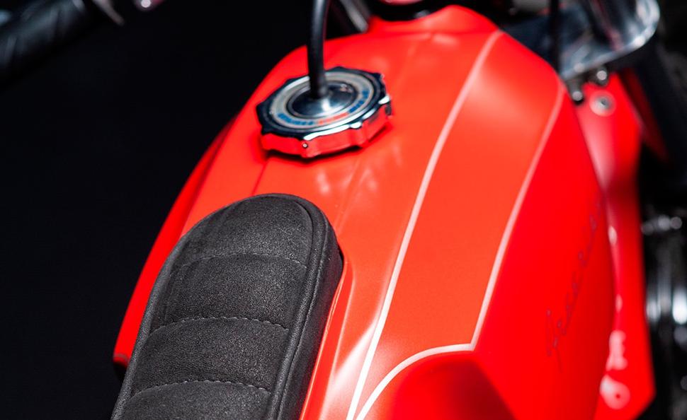 Пьер добавил подходящий кастомный обтекатель из стекловолокна и маленькие алюминиевые крылья. Маляры из Midwest Aero Design выкрасили все в глубокий красный цвет, а раму обработали покрытием черного цвета на основе эпоксидной смолы, благодаря чему она буквально растворилась в общем облике мотоцикла.