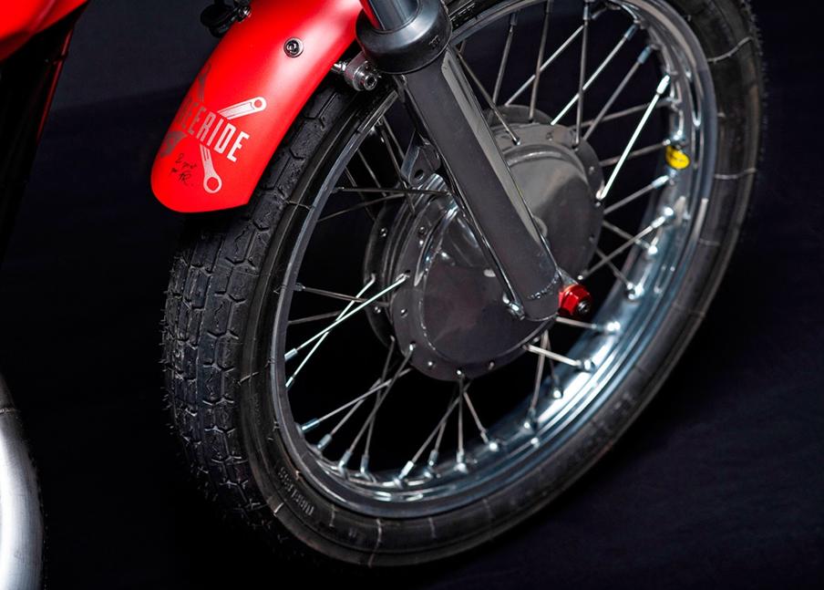 Пьер перебрал и укоротил оригинальную вилку Betor. Он установил более короткие пружины, соединенные с 18-дюймовым колесом Akront со ступицей от городского мотоцикла Montesa Impala 1960-х годов. Заднее колесо Akront амортизируется новыми амортизаторами YSS.