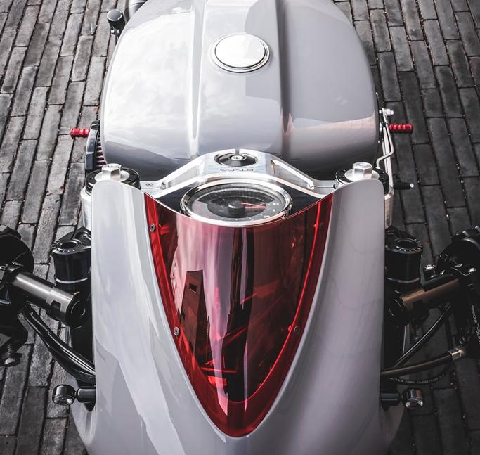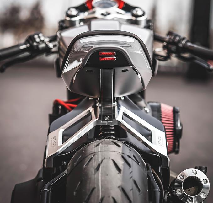 Для нового кафе рейсера были созданы композитный передний обтекатель, бак, хвостовая секция, все в стиле продолговато-ребристого дизайна оригинального XLCR. Кастомные элементы дополнили короткое переднее крыло и кожух заднего амортизатора.