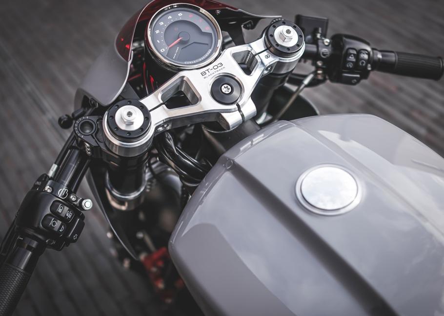Другие кастомные алюминиевые компоненты, созданные для байка, включают в себя новый комплект траверс и кафешные лапки КПП и тормоза с задней установкой. Blacktrack разработали эти элементы у себя и заказали их изготовление у технического партнёра, владеющего станком с ЧПУ.