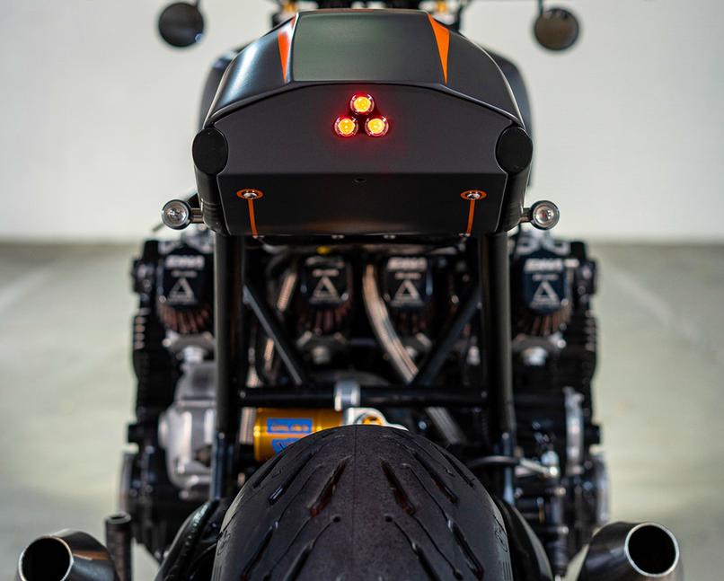Хвост этого кафе-рейсера несколько отличается от традиционной петли. В нём стоит аккумулятор, втягивающее реле стартера и три миниатюрных задних фонаря Hollow Tip из каталога PBM, внутри которых размещены ещё более точечные диодные стоп-сигналы.
