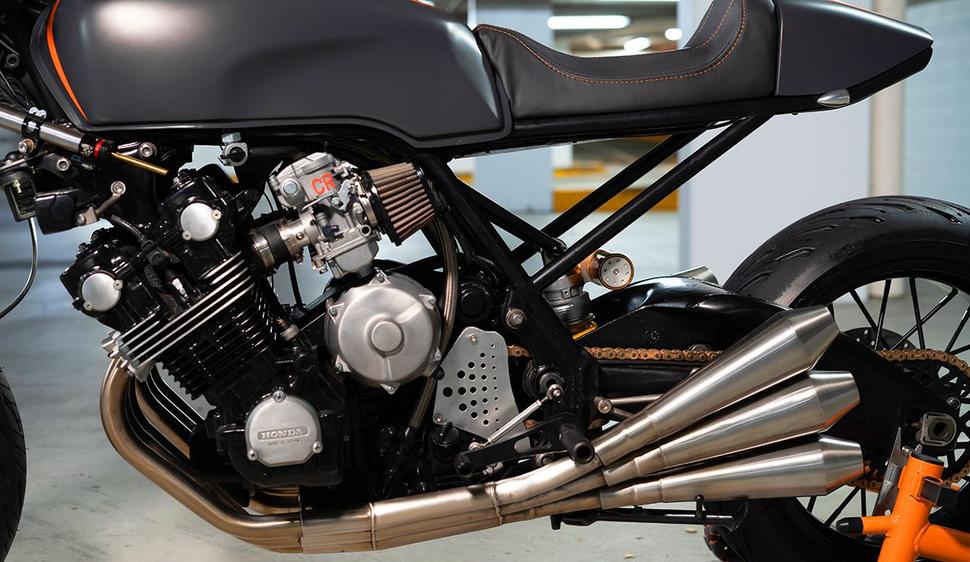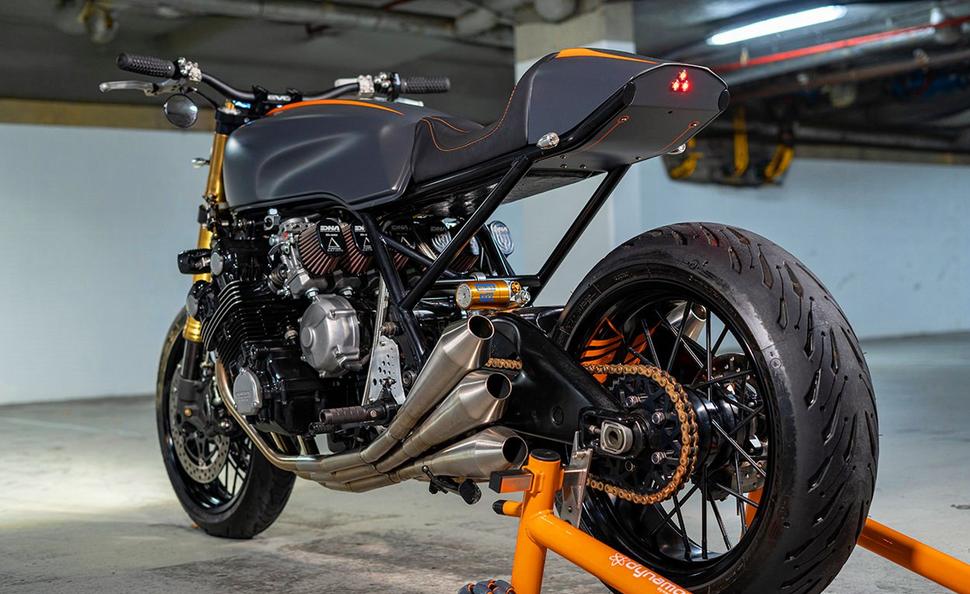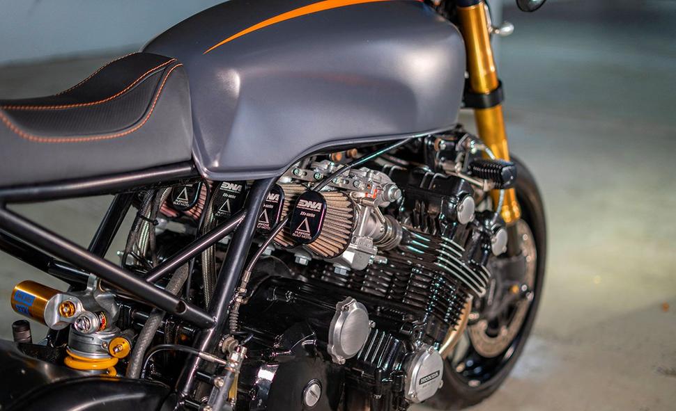 Hond-е придали форму изящного кафе-рейсера, сохранив внушительный бак, но поставив на современные подвески и колёса. И, конечно, доработав по части производительности:
