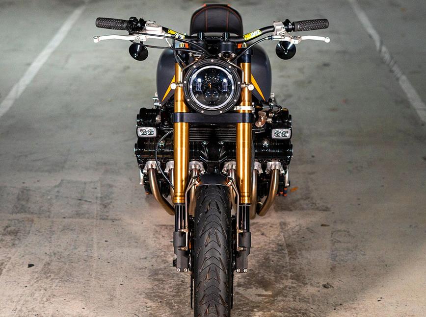 Вилка от Бусы легко встала в изготовленные на заказ траверсы. Том поставил средней высоты руль ProTaper Contours формы "Carmichael", а на него - новые крепления приборной панели, диодную фару Flashpoint и новенькие современные пульты. По бокам от могучего мотора стоят небольшие фары, работающие в качестве дневных ходовых огней и придающие мотоциклу стритфайтерный флёр.