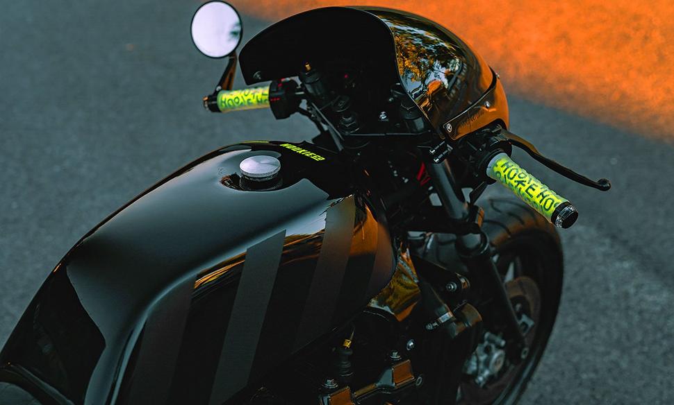 Родной слишком большой и бесформенный, поэтому я взял бак от Honda Bol d’Or [Это CB750F] с откидной крышкой. Он придал проекту клёвый олдскульный штришок.