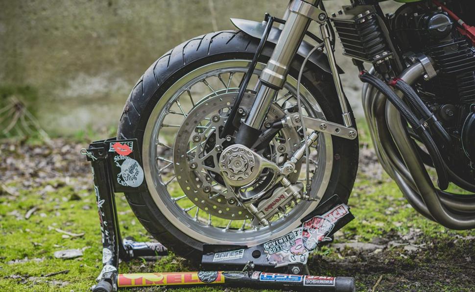 Затем на кастом кафе рейсер была установлена передняя часть от Ducati 848 с помощью траверс Ducati и клипоны от Ducati 748. После этого оказалось, что оригинальные колеса Zephyr совершенно не вписываются в желаемый облик, поэтому был приобретен практически новый комплект дисков от Triumph Thruxton 1200.