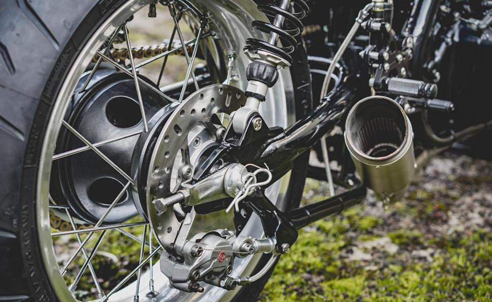Заднее колесо подошло идеально, передняя и задняя звездочки хорошо встали в линию. 2-поршневый суппорт Brembo установили на изготовленное вручную крепление. (Сидит очень плотно и отлично справляется со своими обязанностями.)