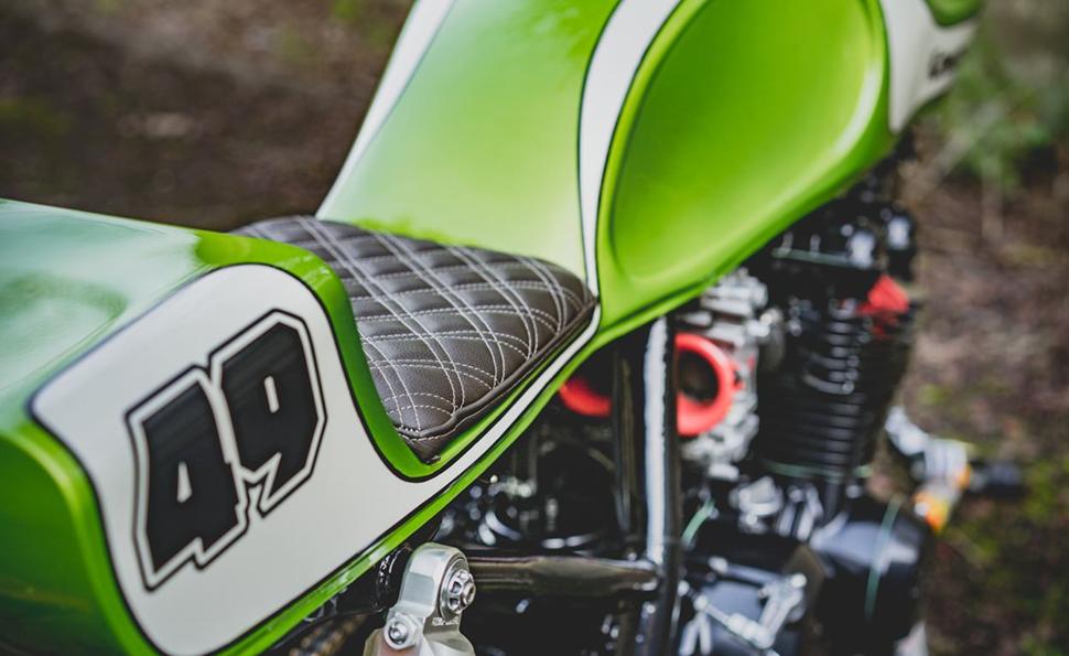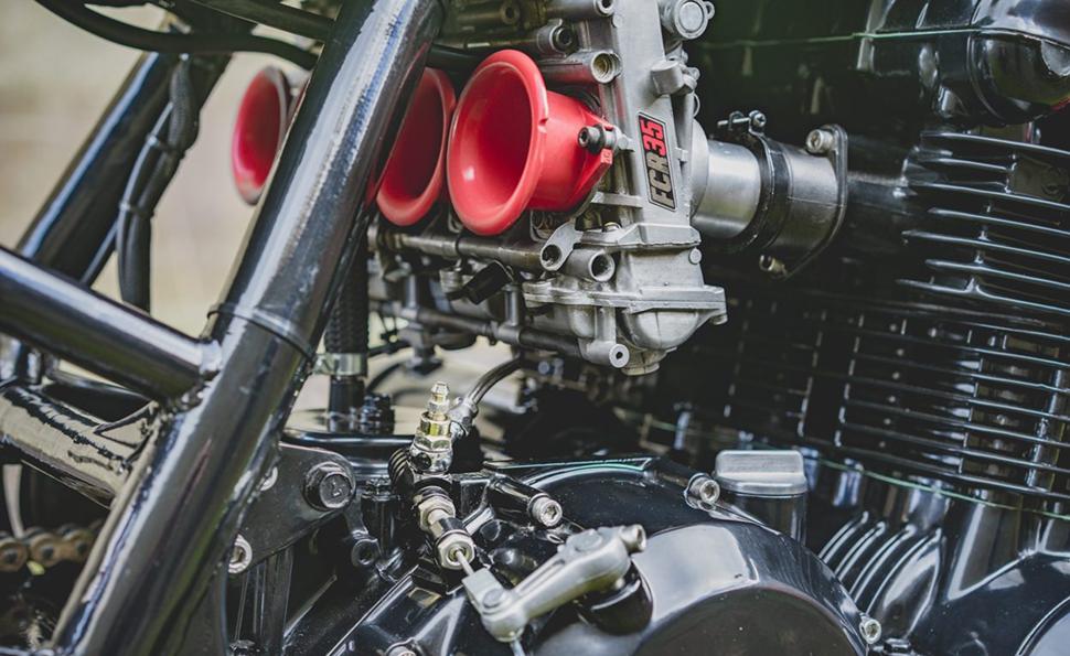 Затем Линда и Пол принялись за двигатель, рядную четверку DOHC с воздушным охлаждением. Они полностью его перебрали и покрасили в чёрный цвет. Родное сцепление заменили на гидравлическое, а 32 мм карбюратор Keihin на FCR35 с плоским, быстрым дросселем. (Его пришлось заказывать в Японии, но он стоил того.)
