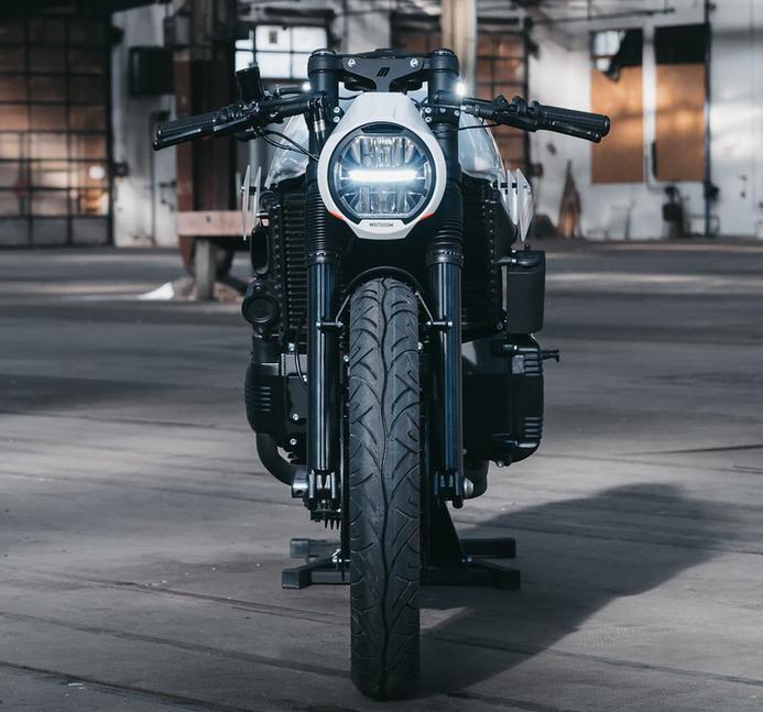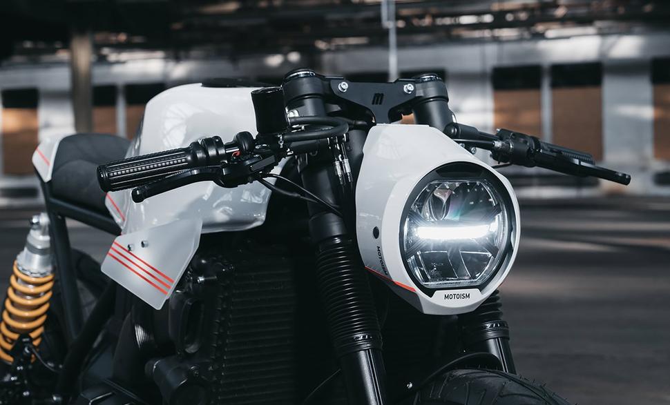 Спереди Motoism установили новый кожух фары на кронштейны из нержавеющей стали, вырезанные на лазерной резке. В нём установлена диодная фара Koso Thunderbolt и небольшой цифровой спидометр Motogadget, аккуратно встроенный сверху. Там же имеется изящный ряд диодных индикаторных огоньков и скрытый приёмник для бесконтактного ключа системы зажигания.