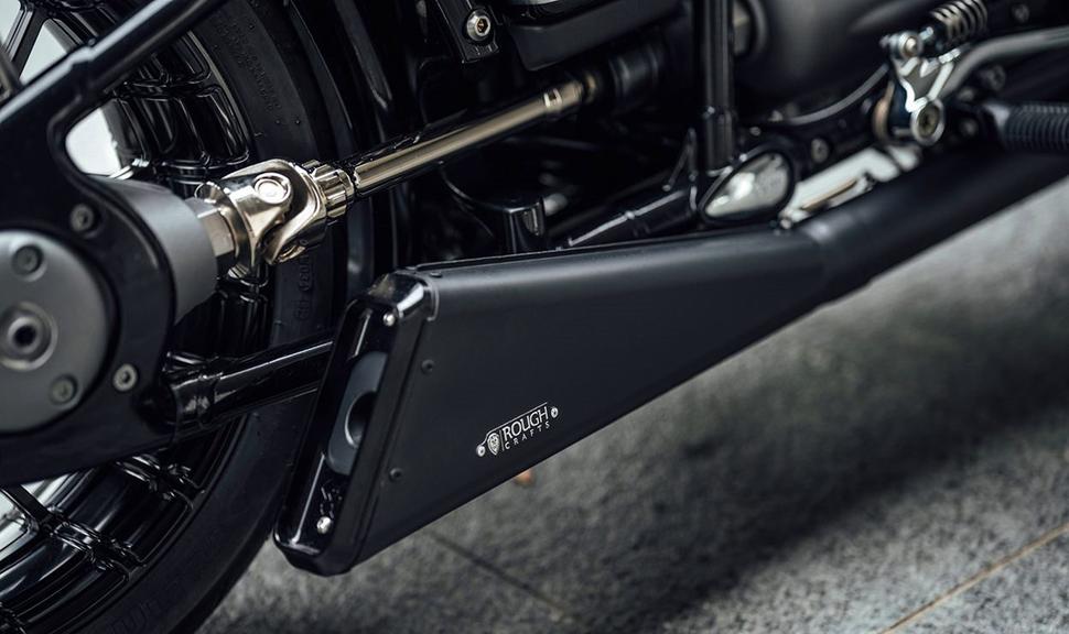 Передняя крышка мотора и клапанные крышки - серийные производства RSD, а вот красивые металлические бейджики изготовлены на заказ частым партнёром Rough Crafts по проектам - Abnormal Sides. Владельцы R 18, пребывающие в сомнениях по поводу штатных глушителей с рыбьими хвостами на концах, будут рады узнать, что выхлоп этого проекта тоже выпускается серийно и будет доступен в продаже.