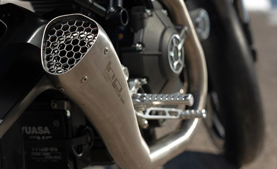 Выхлопная система держится на кастомных крепления. Также мотоцикл оснащен кастомными подножками и ножными органами управления.