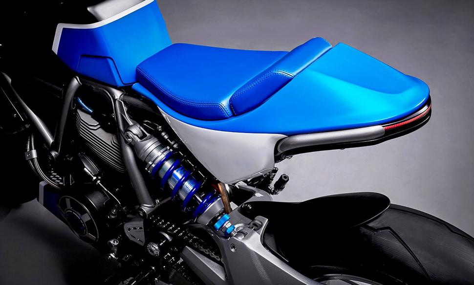 Флэт-трекерный хвост - ещё одно мелкосерийное изделие, изготовленное BRKT Moto из США. NUEN оснастили его двухкомпонентным седлом, обшитым в ярко-синюю кожу. Позади него - аккуратная диодная полоска, а внутри хвоста расположен отсек с электроникой.