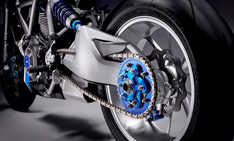 Также от Hypermotard достался односторонний маятник, подвешенный на моноамортизаторе FG Gubellini. 17-е колёса позаимствованы от Ducati Monster 1100 и оснащены фланцем задней ступицы от CNC Racing и шинами Pirelli Diablo Super Corsa. Тормозит кастом суппортами Beringer по дискам Galfer.
