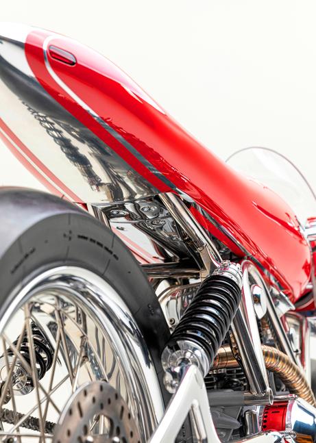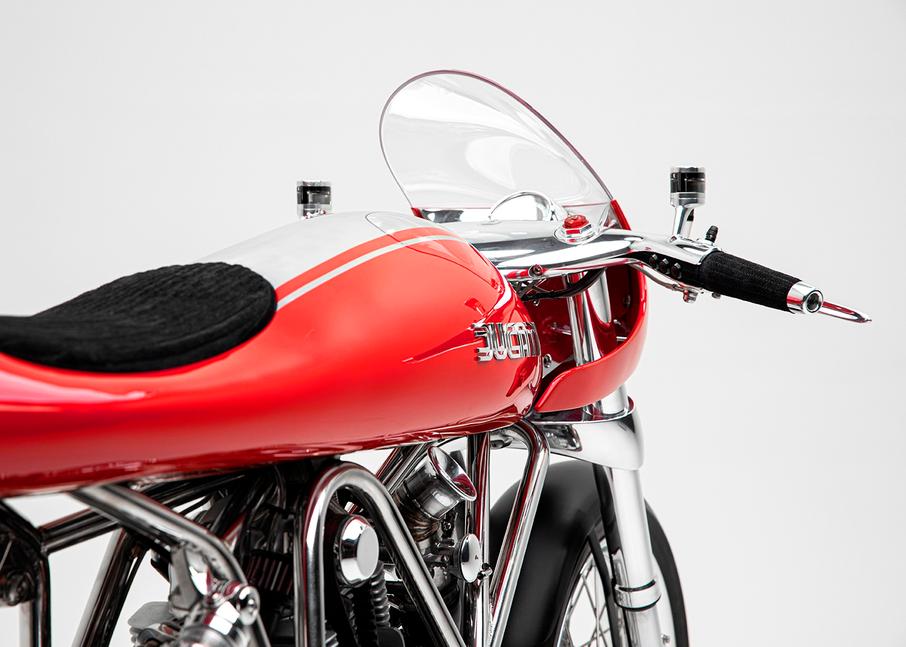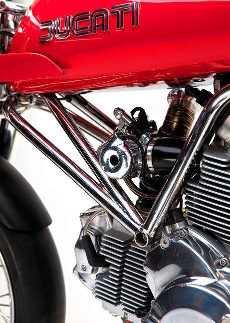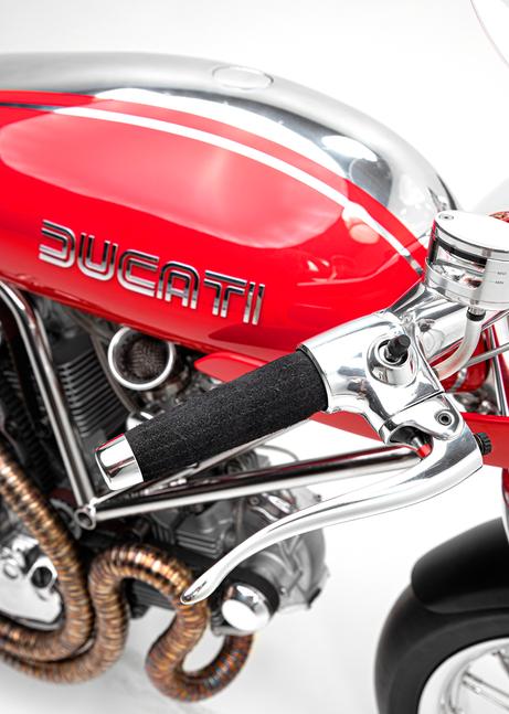 Кастомная электросеть мотоцикла с твердотельным блоком управления включает беспроводной замок зажигания и аккуратно спрятанные поворотники от Supernova. Окраска состоит из семи слоёв Ducati Red, а на циферблате кастомной приборки красуется имя мотоцикла.