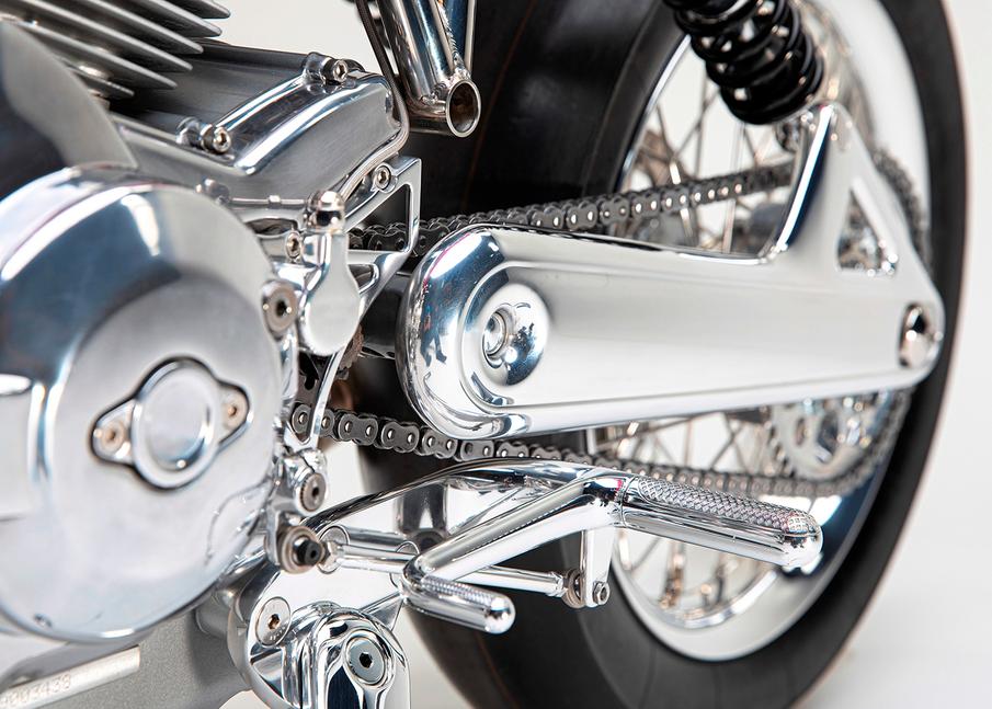 Двигатель имеет красивый винтажный вид, но обладает современными характеристиками, например, инжекторной системой питания. Он выдаёт 140лс, которых более чем достаточно для 181-килограммового мотоцикла. Это достигнуто при помощи кастомного выхлопного тракта 2-в-1, состоящего из множества отдельных нарезанных кусочков и более чем 50 метров сварного шва. Изнутри мотор был полностью откапитален, получил проскальзывающее сцепление и гоночное ЭБУ, а также впускные воронки и красивые фрезерованные на ЧПУ крышки.