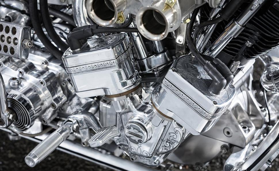 Двигатель Harley Davidson Shovelhead 1973 года был переделан в 93-дюймового (объем) огнедышащего монстра. Его оснастили сдвоенным карбюратором Weber с боковым потоком, сдвоенным зажиганием Morris Magneto, маховиком S&C Cycle, увеличенными поршнями и кастомным распредвалом CW Zon. Две свечи зажигания на цилиндр обеспечивают эффективное и полное сгорание топлива, а отработанная смесь удаляется через короткий открытый выхлоп 2-в-2. И, наконец, всё это сопряжено с шестиступенчатой коробкой от Baker с первичной передачей на двухдюймовом ремне и цепным конечным приводом.