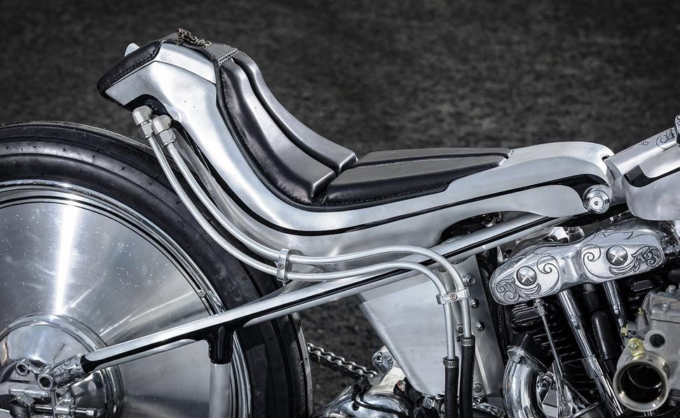Например, в вилку Harley Davidson Shovelhead аккуратно спрятан амортизатор от горного велосипеда, передний и задний свет полностью диодный, а простенькая приборная панель оборудована современными кнопками и единственным диодным индикатором. Рычаги на руле от Kustom Tech сопровождаются армированными магистралями, а бачок на левом выдаёт наличие гидравлического привода сцепления. Блестящие грипсы и подножки от Rough Crafts дополняют набор органов управления.