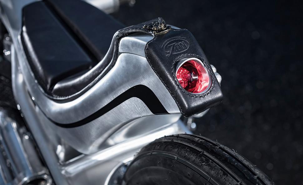 Руль с верхней траверсой представляет собой единое целое, и даже более того - они интегрированы с балочной вилкой. Крошечный цифровой спидометр от Motogadget, встроенный в обращённую к райдеру поворотную пластину, создаёт дерзкий контраст с внушительной и цельной металлической конструкцией. Есть и другие современные штрихи, но они хорошо спрятаны.