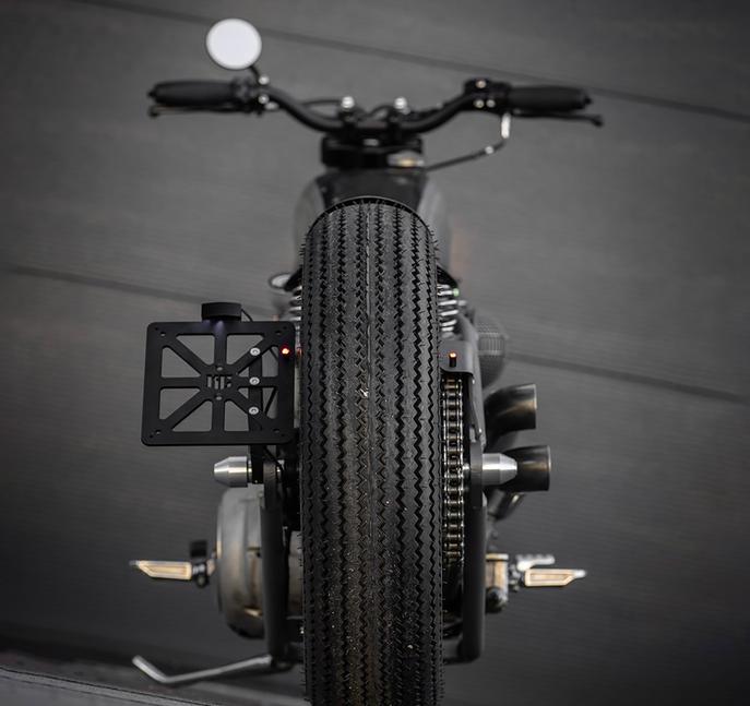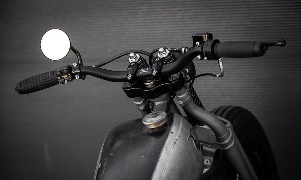 Например, руль переменного сечения на новеньких проставках - от ABM, а установлены они на массивной верхней траверсе от Wunderkind. Руль оснащён современными миниатюрными пультами, рычагами Kustom Tech и грипсами Biltwell Inc. Спидометр от Motogadget притаился слева от бензобака. Фара - кастомная, начинка в ней из афтермаркетной фары, а корпус - от оригинальной противотуманки Harley. Поворотники все от Kellermann, причём задние выступают ещё и в качестве заднего фонаря. Подножки изготовлены Biltwell Inc., крепление номерного знака - от Hippy Killer Kustom, а кожух цепи - самодельный.