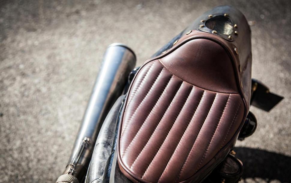 Форма топливного бака похожа на топливный бак старого мопеда. Он покрыт неровностями и зазубринами и линиями медного цвета. Седло обтянуто кожей в античном стиле, оно аккуратно прикрепляется к хвостовой части с помощью ремешков.