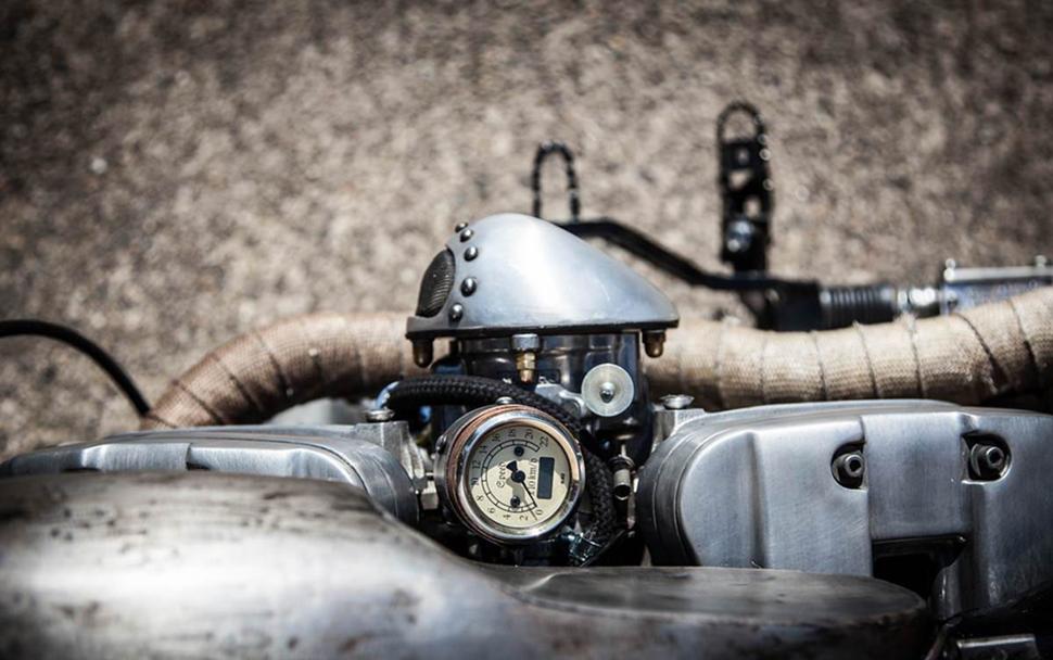 Интересно попытаться угадать, из чего сделаны некоторые детали. Например, воздушный фильтр сделан из модифицированного рупора Lambretta, а крышка контактов -из винтажного дверного глазка. Передний тормозной барабан был вырезан вручную.