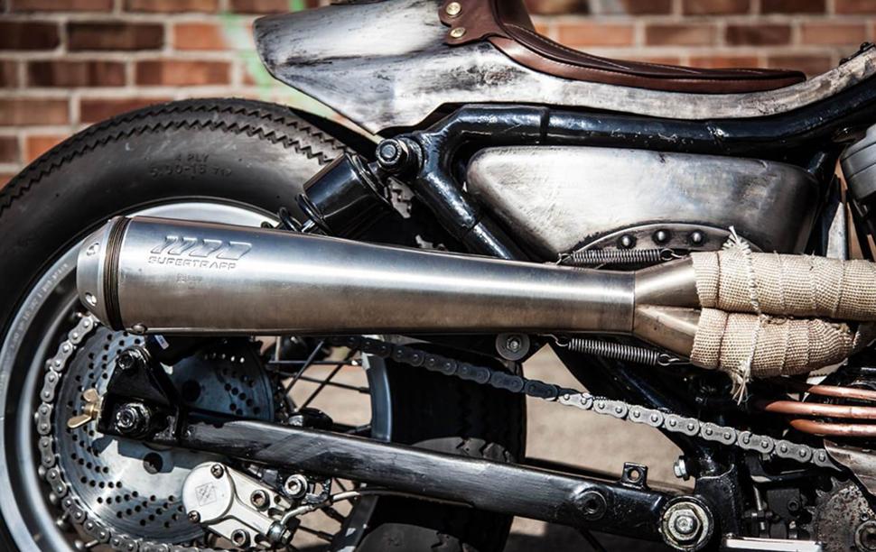 Все внутренние детали двигателя 883 EVO остались стоковыми, а вот оригинальный карбюратор заменили на S&S Super E. Выхлопные трубы расположены высоко в духе скремблера, специальная обмотка отводит тепло от правого бедра пилота. Глушитель SuperTrapp снижает уровень шума.