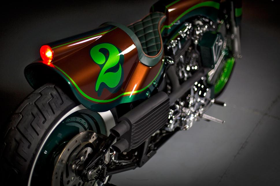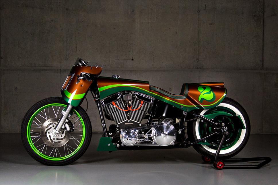 Уникальным металлическим панелям кузова не уступает и широкий комплект других деталей. За корпусом передней фары уютно устроился спидометр Auto Meter, руль LSL, ручки Roland Sands Design и органы управления Beringer. Мотоцикл оборудован ножными органами управления и главной передачей производства Performance Machine.