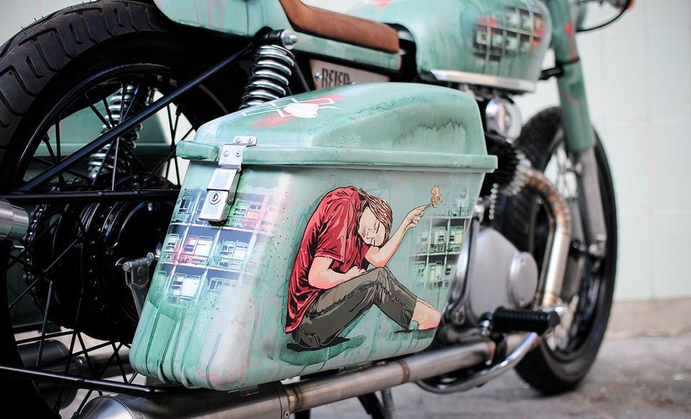 Потрясающая окраска и графика были нанесены австрийско-французской парой уличных художников, известных как Яна и Джей Эс. Им нравится использовать в своих работах городские мотивы, которые, по мнению Кристиана, идеально подходят для этого мотоцикла. Вот ещё один плюс стеклопластиковых кофров: на них полно места для красивых рисунков.