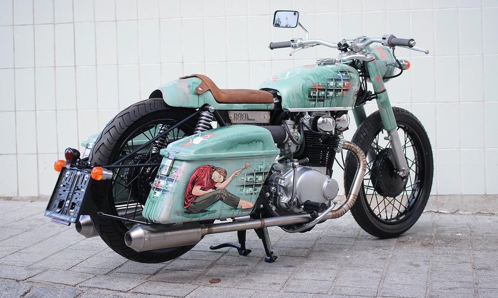 Колёса и рама были окрашены в чёрный, чтобы оттенить графику. Остальной мотоцикл был скрупулёзно отреставрирован и украшен небольшими цветными штрихами (типа зелёных бензошлангов, например).