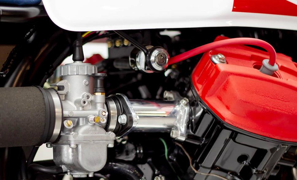 Новые карбюраторы дышат через капсульные фильтры. Нержавеющие выпускные патрубки 2-в-1 БиДжей изготовил сам и оснастил их на выходе глушителем Competition Werks.
